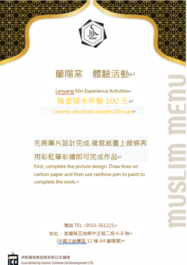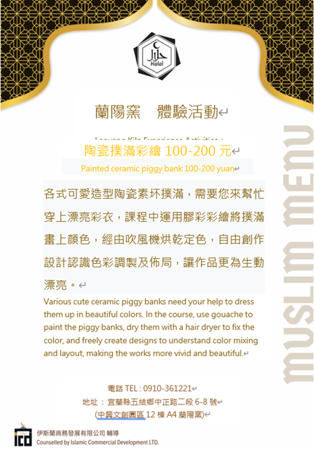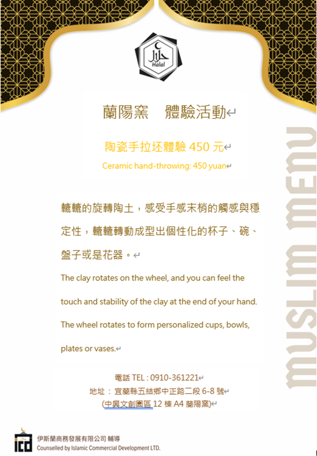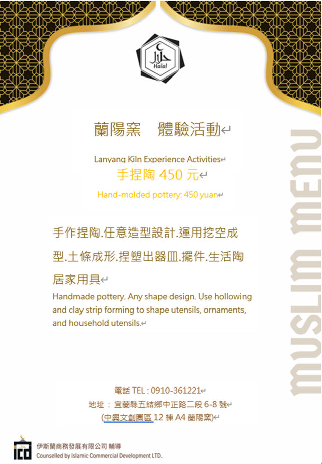 Find Your Journey [Yilan County] Lan Yang Yau 2025-12-03 Share Share Share it on Link general.share.close general.share.copy_to_clipboard 🕌 Muslim-friendly Experience Activity (MFEA) ✅ Experience Activity📞 Phone +886-910-361221 📍 Address No. 225, Meihua Rd., Dongshan Township, Yilan County 🕒 Opening Hours Monday to Sunday 10:00 -18:00 🌐 Links 🪁Experience Activity: Back