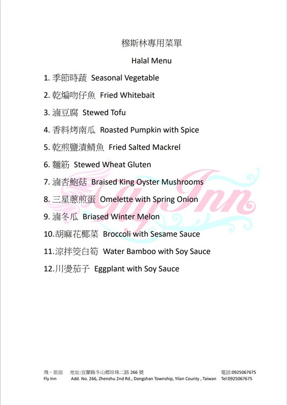 Stay with Comfort [Yilan County] Fly Inn 2025-11-26 Share Share Share it on Link general.share.close general.share.copy_to_clipboard 🕌 Muslim-friendly Accommodation (Breakfast Included) (MFA) ✅ Accommodation&Breakfast 📞 Phone +886-925-067-675 📍 Address No. 266, Zhenzhu 2nd Rd., Dongshan Township, Yilan County 🕒 Opening Hours 🛏️ Check-in time: 15:00 Check-out time: 11:00 🌐 Links 🍴Menu: Back