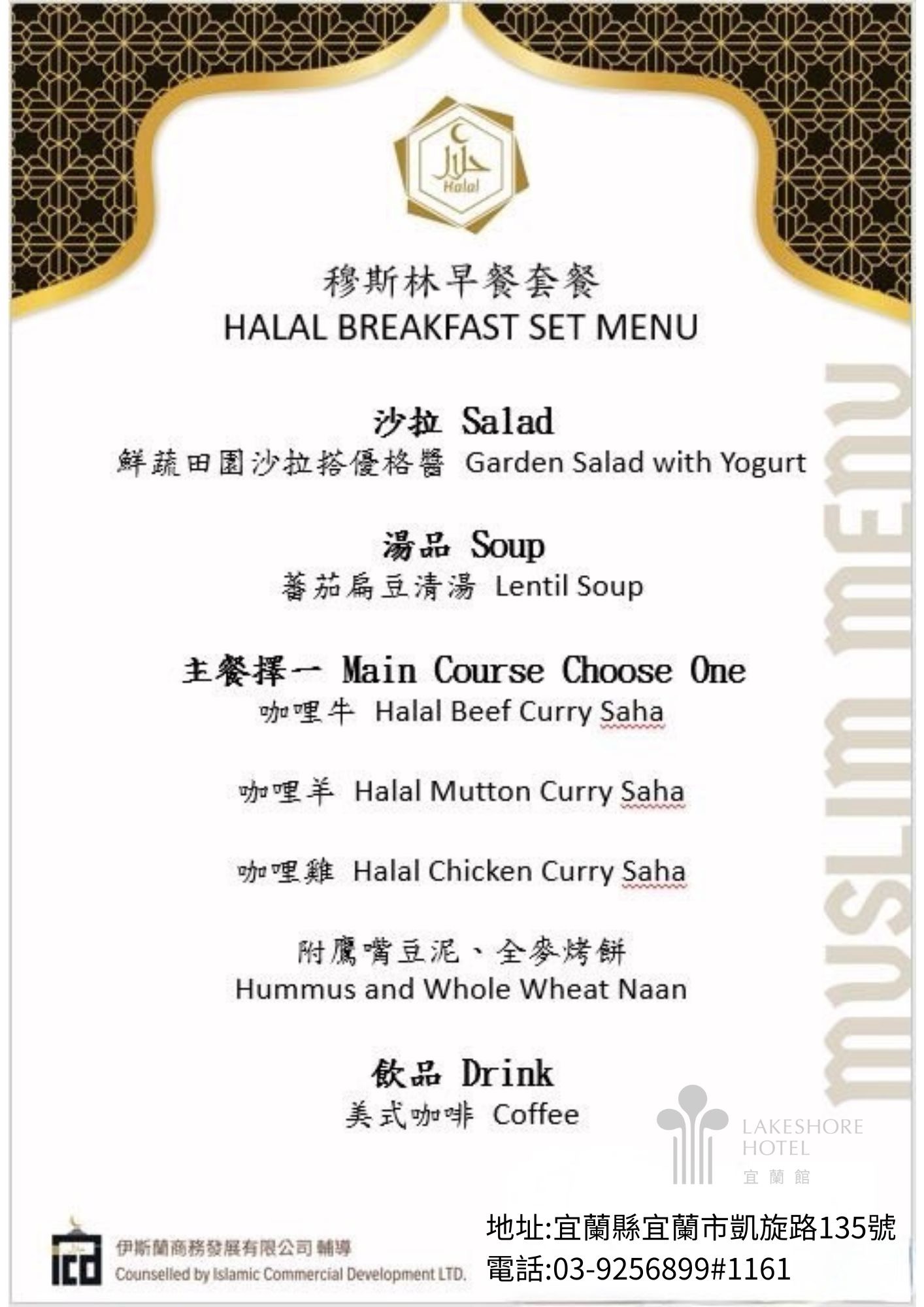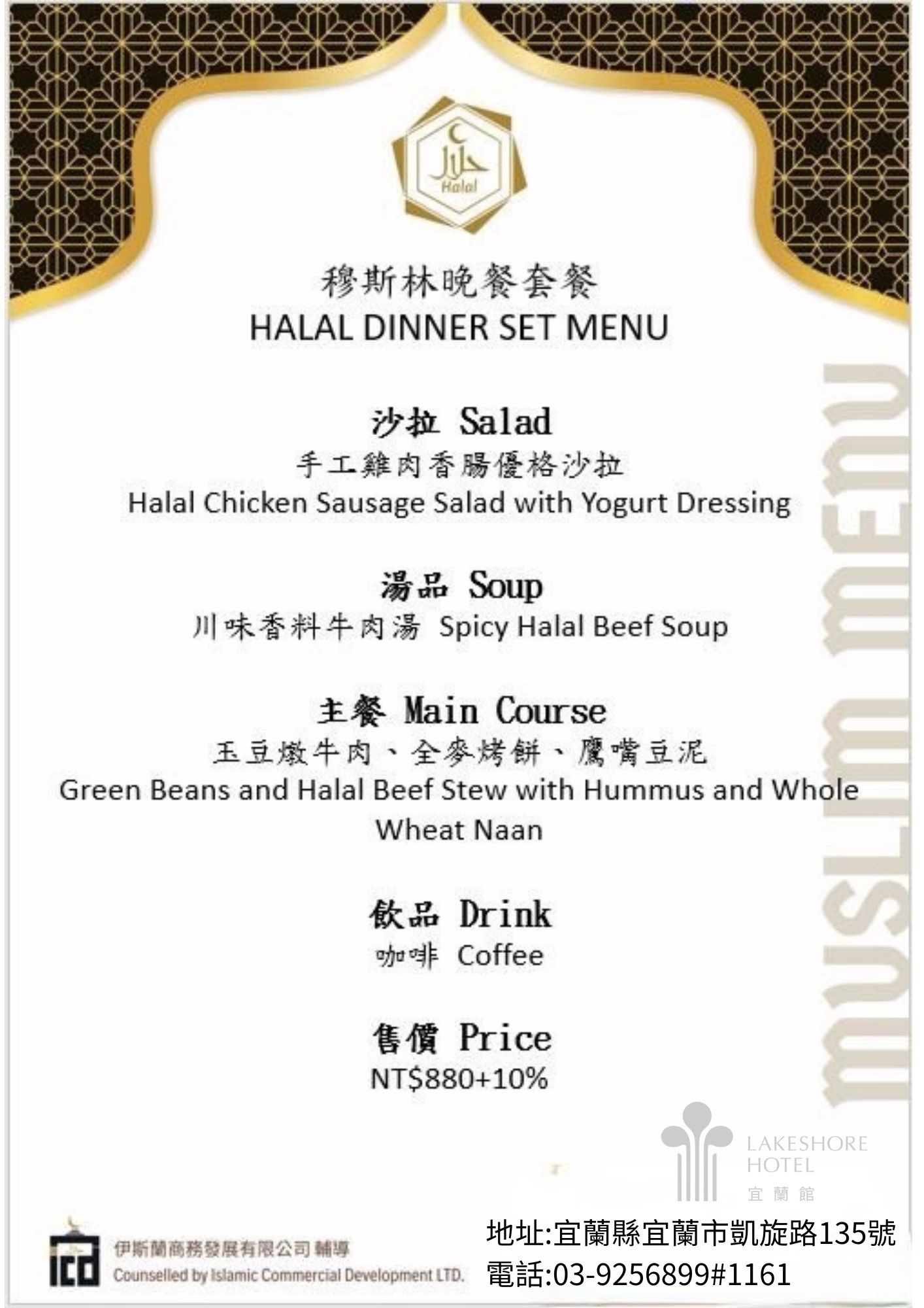 Taste the Flavors [Yilan County] Lakeshore Hotel Yilan 2025-11-18 Share Share Share it on Link general.share.close general.share.copy_to_clipboard 🕌 Muslim-Friendly Restaurant (MFR) ; Muslim-friendly Accommodation (Breakfast Included) (MFA) ✅ Lunch, Dinner / Accommodation&Breakfast 📞 Phone +886-3-925-6899 📍 Address No. 135, Kaixuan Rd., Yilan City, Yilan County 🕒 Opening Hours 🛏️ Check-in time: 15:00 Check-out time: 11:00 🌐 Links 🍴Menu: Back